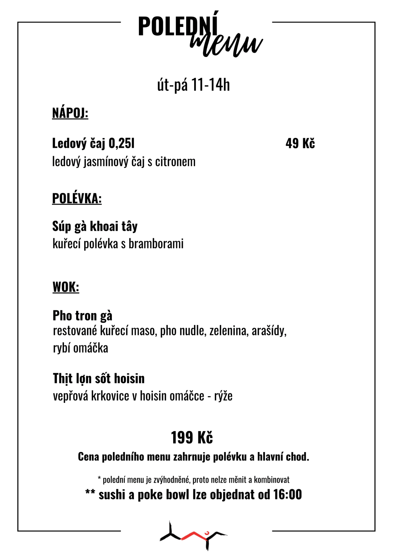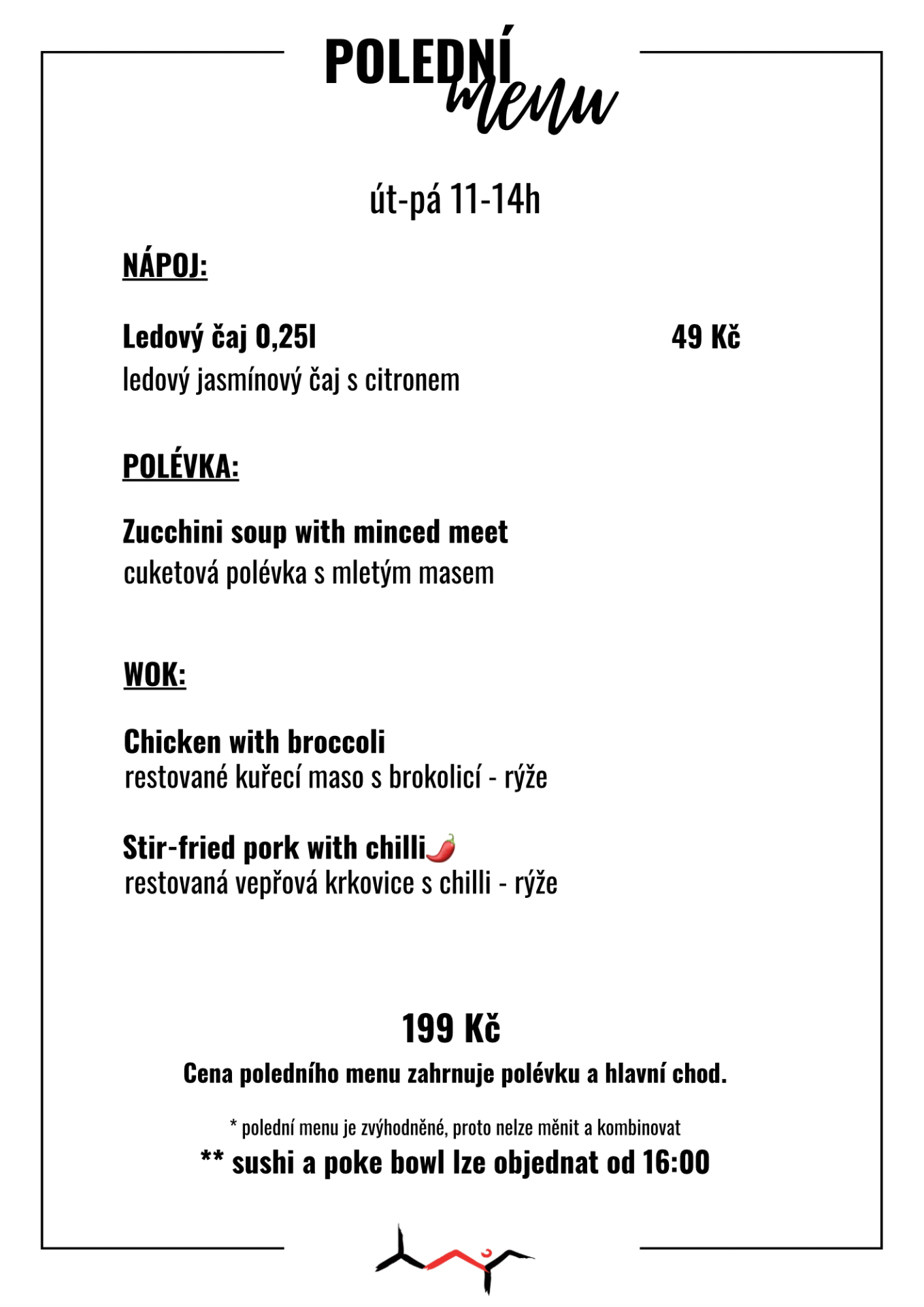 Naše polední menu je ideální volbou pro ty, kteří mají málo času nebo si chtějí užít rychlý a chutný oběd během polední pauzy. Nabízíme jej od úterý do pátku od 11:00 do 14:00 hodin. Naše nabídka zahrnuje širokou škálu jídel, takže si vybere opravdu každý podle své chuti. Je důležité zmínit, že v našem poledním menu nenajdete jídla z večerního menu, protože naši kuchaři stále experimentují a přinášejí nové pokrmy, které obohatí váš kulinářský zážitek. Nabídka se pravidelně mění, abyste pokaždé našli něco nového a lákavého. Pokud byste během oběda chtěli přijít na své oblíbené jídlo, můžete si ho objednat z večerního menu. Jen malé upozornění, sushi a poke připravujeme až od 16:00.